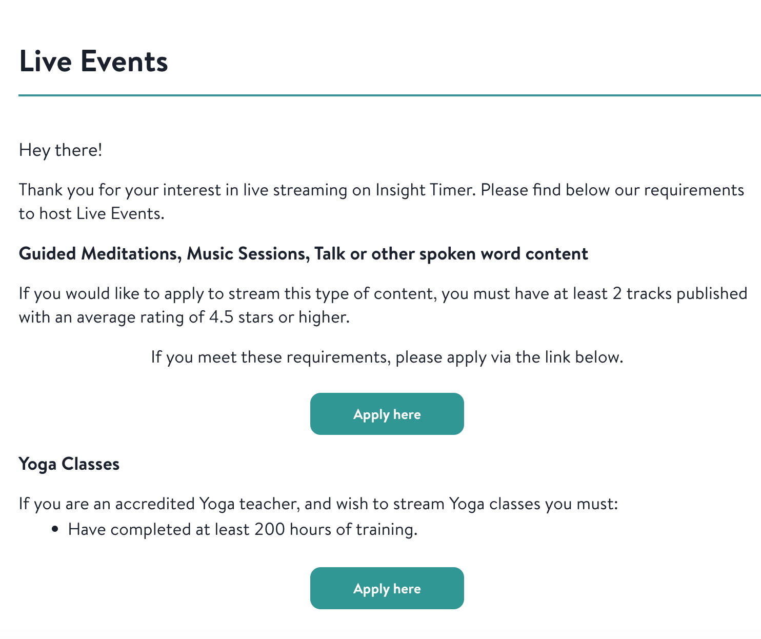 For Live Yoga: Use this link to apply for Live Yoga events. You may also want to review this detailed guide about becoming a yoga teacher on Insight Timer for additional information specific to yoga instructors.