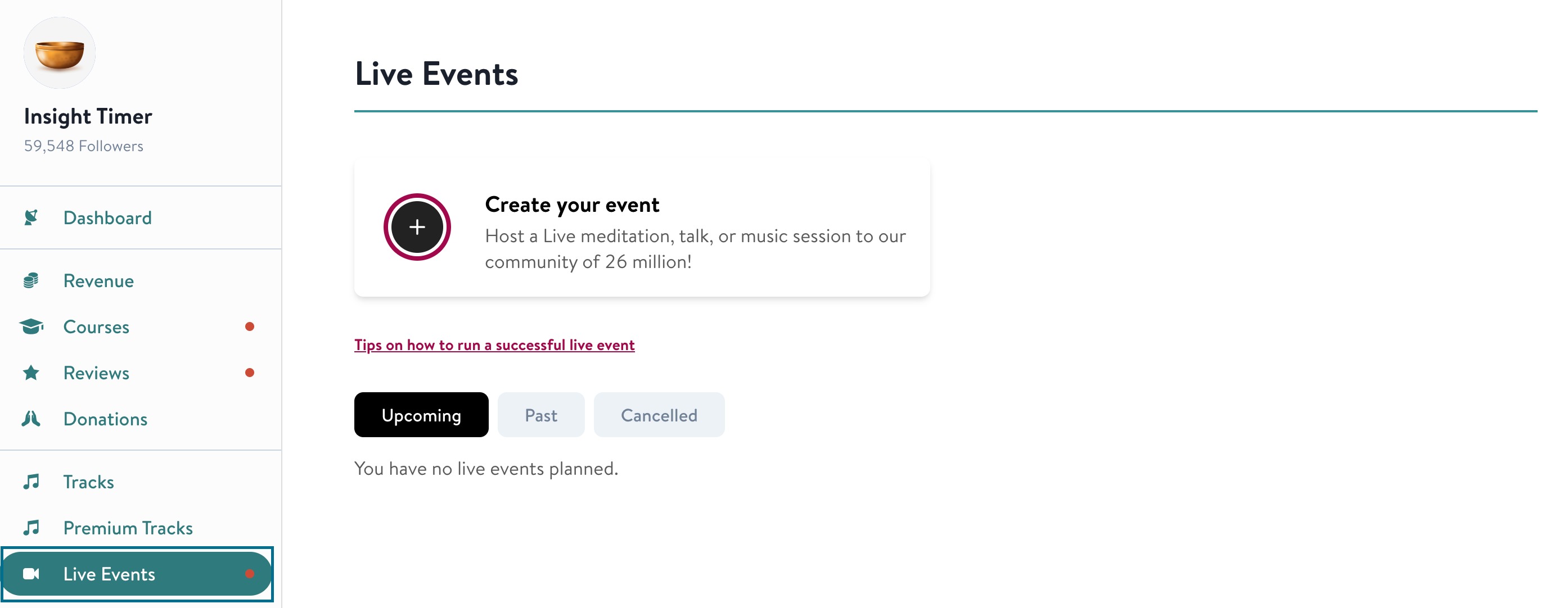 If you don't see the Live Events tab in your dashboard immediately after receiving your approval, it may take a short time to appear in your account. If it's been more than a few hours and you still don't see it, please reach out to our support team at publishers@insighttimer.com. They can help troubleshoot any access issues and get you set up right away.