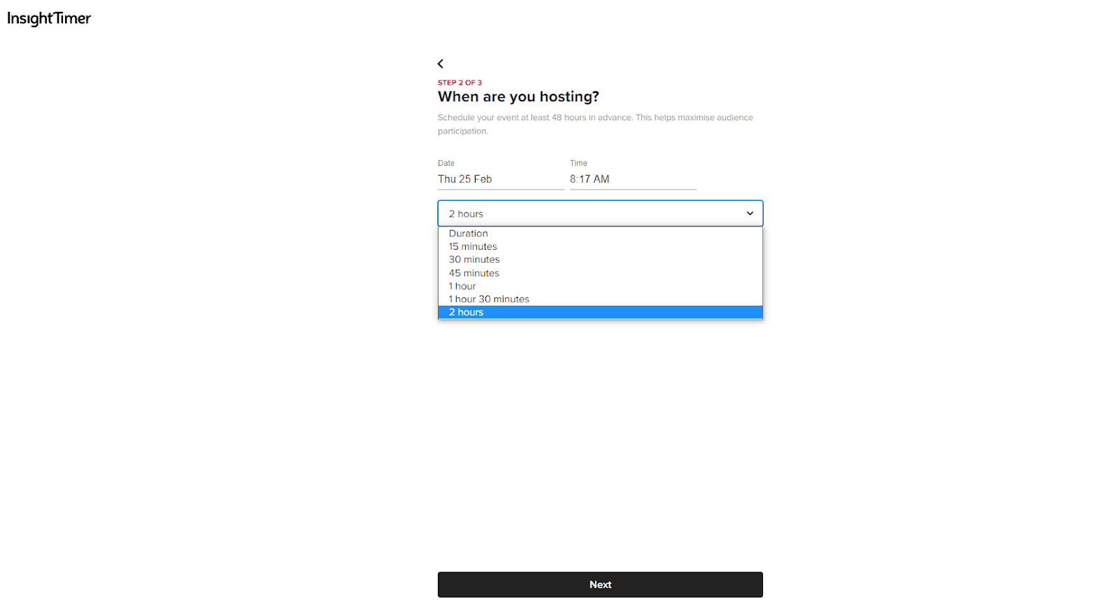 You have flexibility in how you schedule your event, but there is one important limit: the maximum duration for any live event is 2 hours. This helps keep sessions focused and manageable while still giving you plenty of time to deliver meaningful content and interact with attendees.