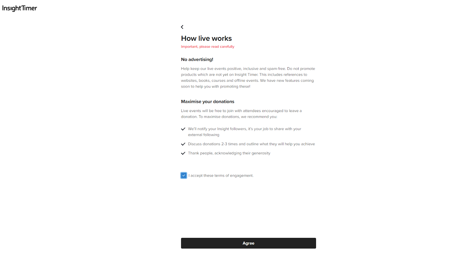 Before you can host a live event on Insight Timer, there are a few requirements you'll need to meet. These are in place to help ensure a positive experience for both you and the community members who attend your sessions. They also help us maintain the quality and integrity of our live events offerings.