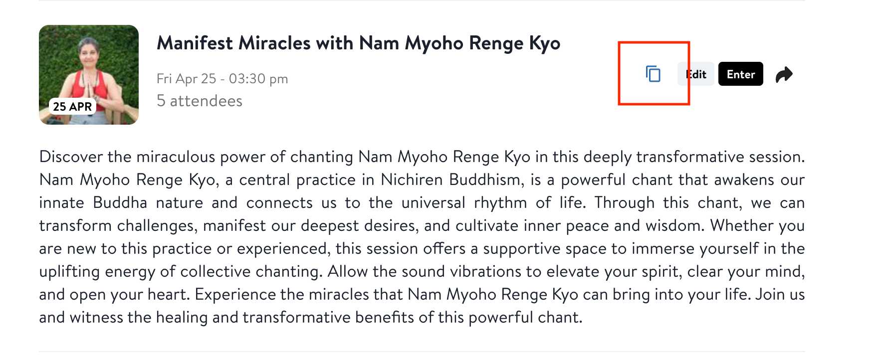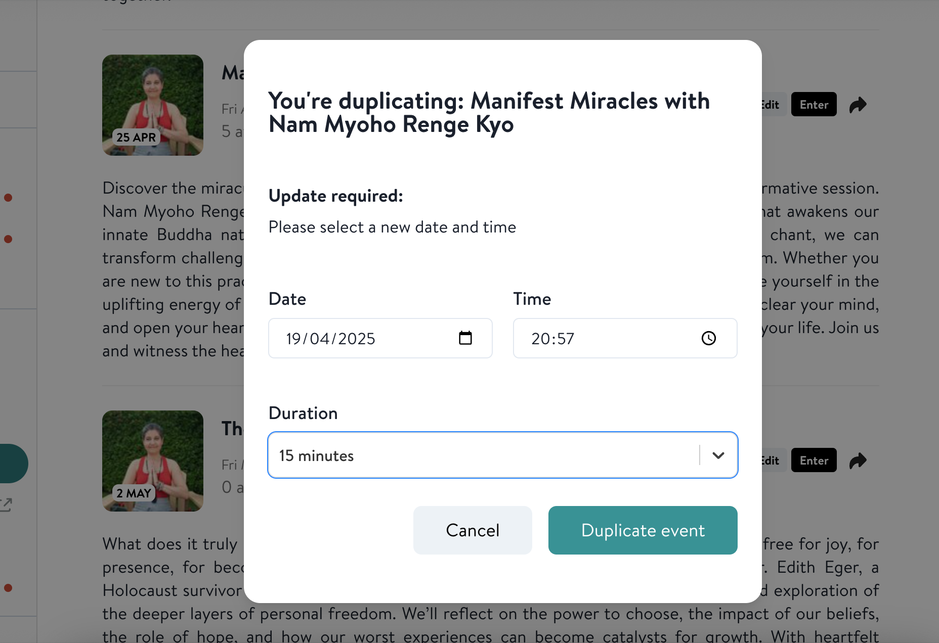 Here's a helpful time-saving feature that many of our teachers love: you can duplicate an existing live event and use it as a template for your next one. This is particularly useful if you're planning to teach similar sessions regularly or want to host the same class at different times. Instead of filling out the entire form again from scratch, you can copy all the details from a previous event and just update the date, time, and any other information that's different for the new session.