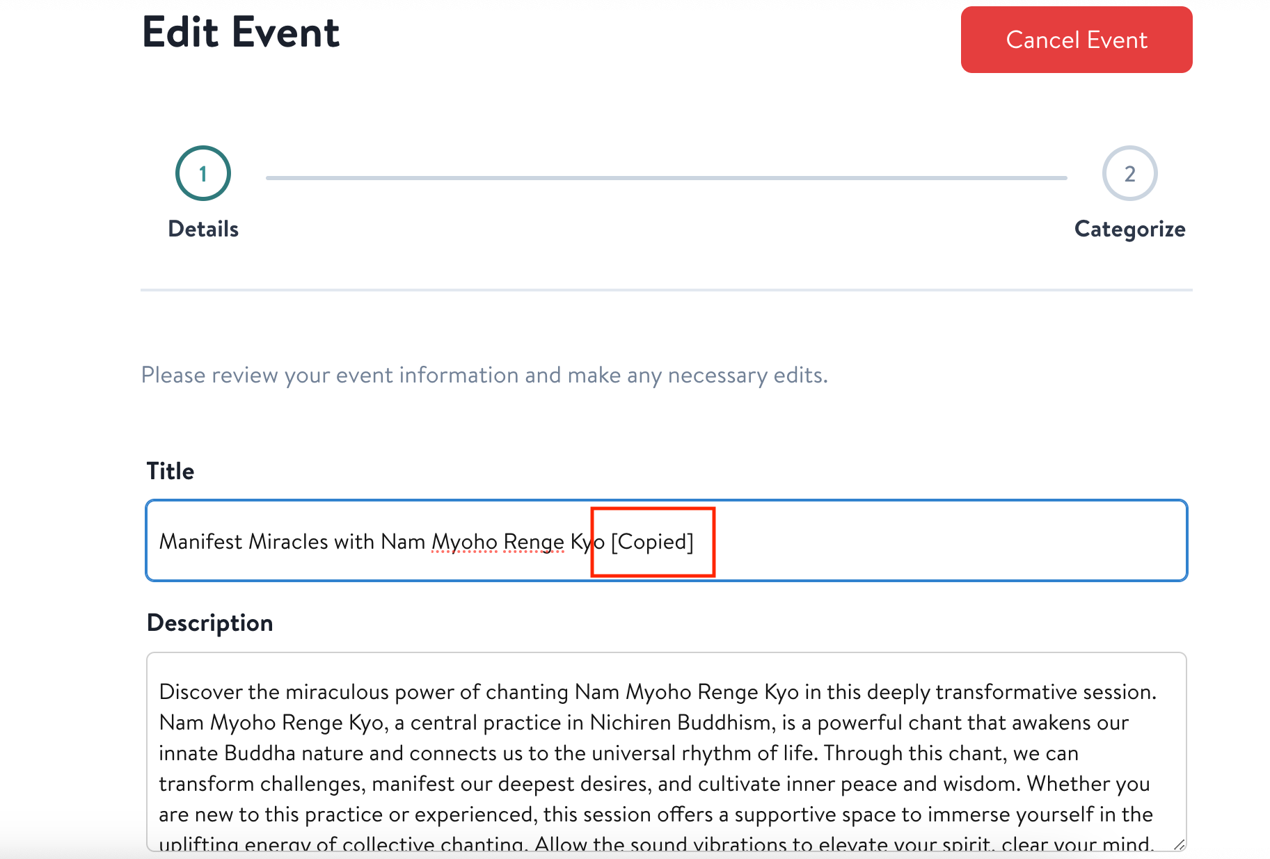 As you go through the form, update all the relevant information for your new event. One important thing to remember: when you duplicate an event, the system automatically adds "[Copied]" to the event title to indicate that it's a duplicate. You'll want to remove this label and replace it with the actual title for your new session. This ensures that community members see the correct event name when they browse your offerings.