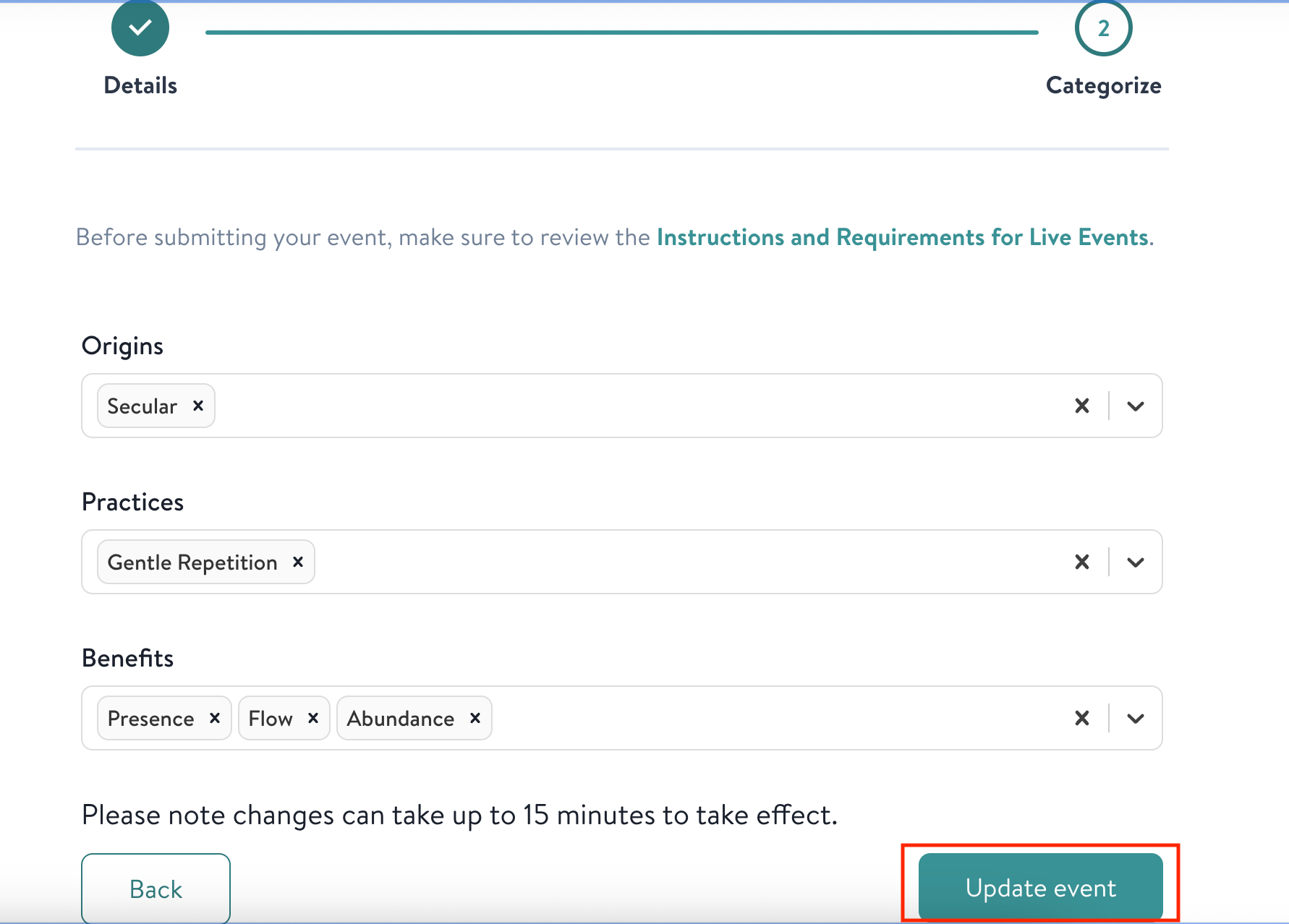 Before you finalize your duplicated event, review all the categorization choices (origin, practice type, benefits) to make sure they're still appropriate for this new session. If you need to change any of these, now is the time to do so. Once everything looks correct, click the "Update Event" button to submit your duplicated event proposal for approval. It will go through the same review process as any new event you create.